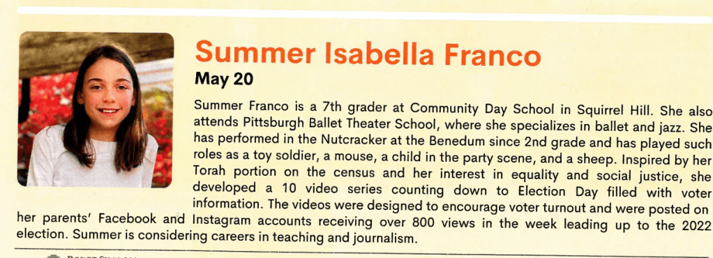 Inspired by her Torah portion on the census and her interest in equality and social justice, she developed a 10 video series counting down to Election Day filled with helpful information for voters. The videos were designed to encourage voter turnout and were posted on her parents’ Facebook and Instagram accounts, receiving over 800 views in the week leading up to the 2022 election.